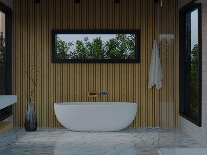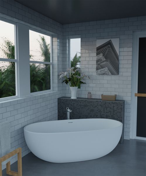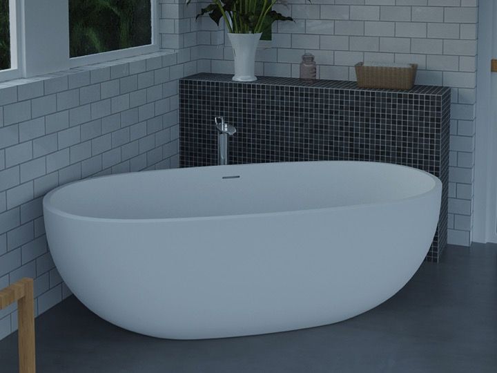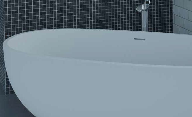 Fritstående badekar er lavet af Acrysolid harpiks i solid overflade. Det er et materiale, der består af to tredjedele af naturlige mineraler og en lille procentdel af harpiks med høj styrke.