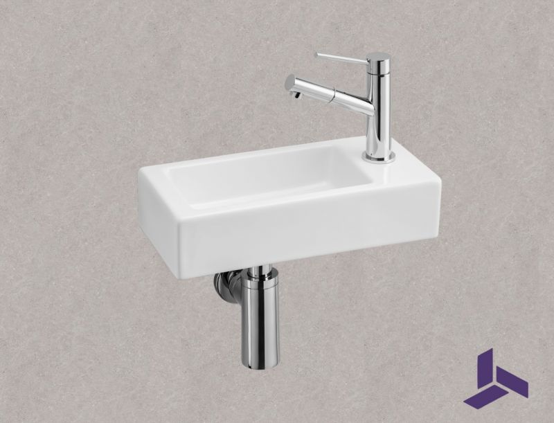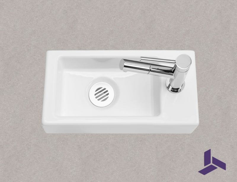 Denne lille rektangulære håndvask lavet af skinnende hvid keramik er ideel til smalle toiletter eller små rum, da den er kompakt, elegant og funktionel.