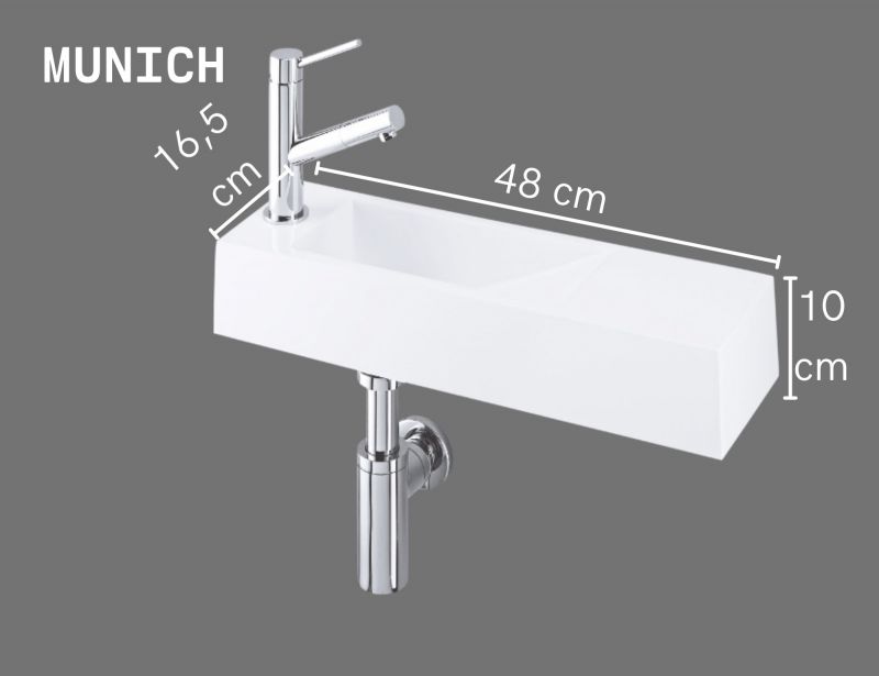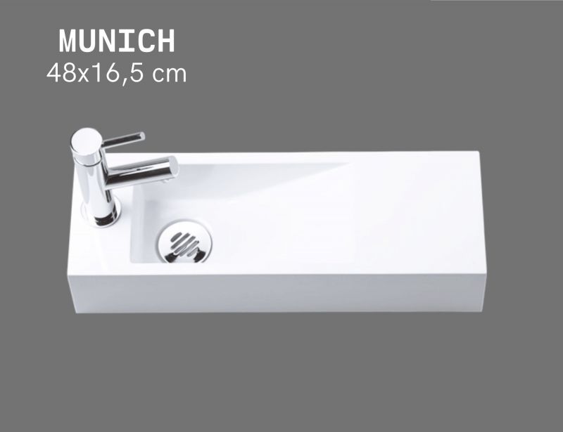 Lave-mains mural ultra-étroit 48x16,5 cm en résine minérale blanc brillant. Design rectangulaire suspendu, sans trop-plein, avec trou pour robinet à gauche et plage latérale 14x16,5 cm idéale pour savon ou accessoires. Structure effilée et lignes nettes pour un effet contemporain et harmonieux.