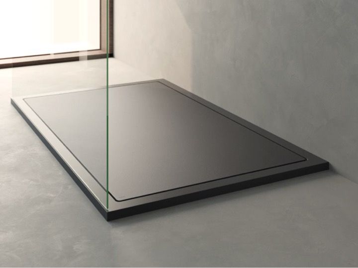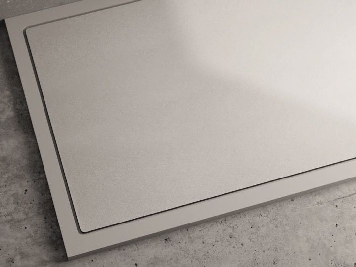 Designerski brodzik prysznicowy z dyskretnym odpływem, wyjątkowo płaski z fakturą kamienia.