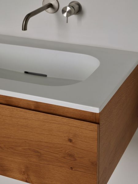 Håndvask med integreret håndvask, ophængt eller placeret på badeværelsesmøbler, i Akrytan® mineralharpiks, glat mat finish.