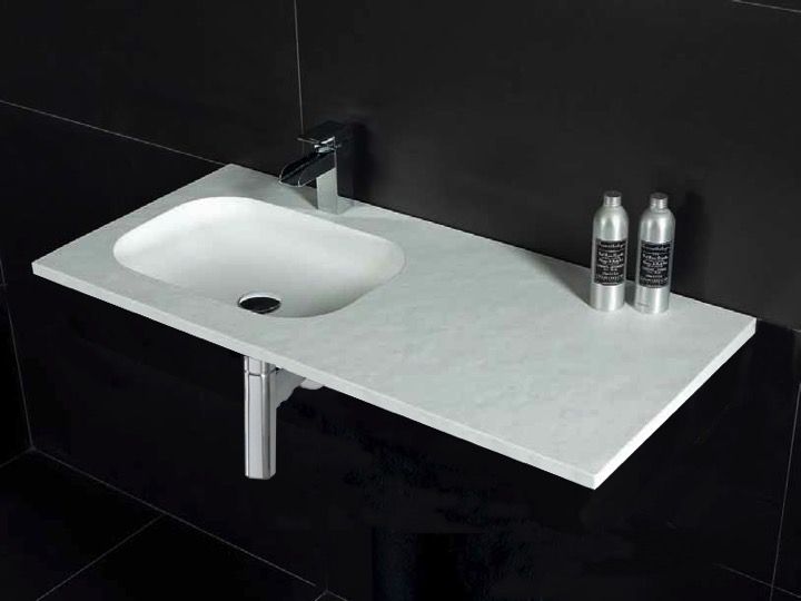 Blat z podwójną toaletką, zawieszony lub wpuszczony w meble łazienkowe, wykonany z żywicy mineralnej OSolid Plus, o fakturze matowo-kamiennej lub o matowej gładkiej fakturze.