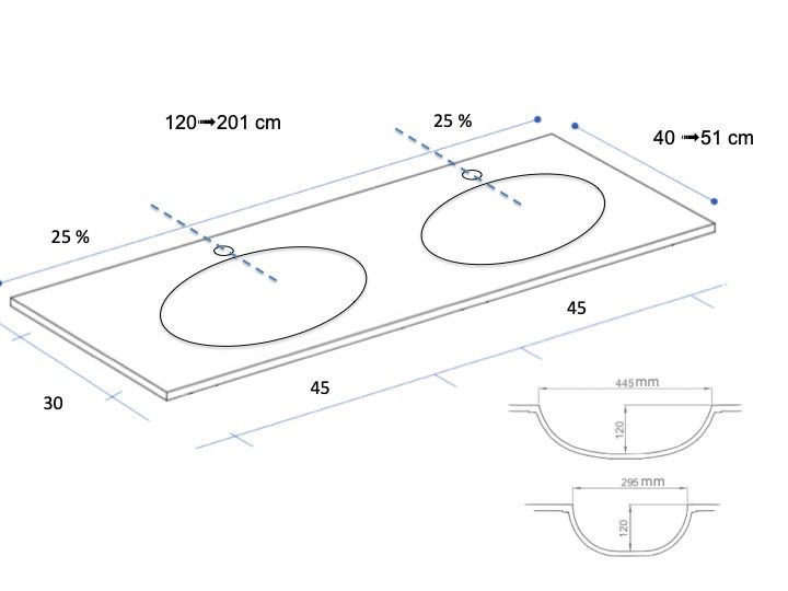 L'emplacement du bassin sur le plan est modifiable, ainsi que le trou de robinetterie. La taille du bassin n'est pas modifiable.