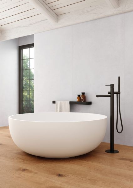 Fritstående badekar er lavet af Solid-Surface harpiks. Det er et materiale, der består af to tredjedele af naturlige mineraler og en lille procentdel af harpiks med høj styrke.