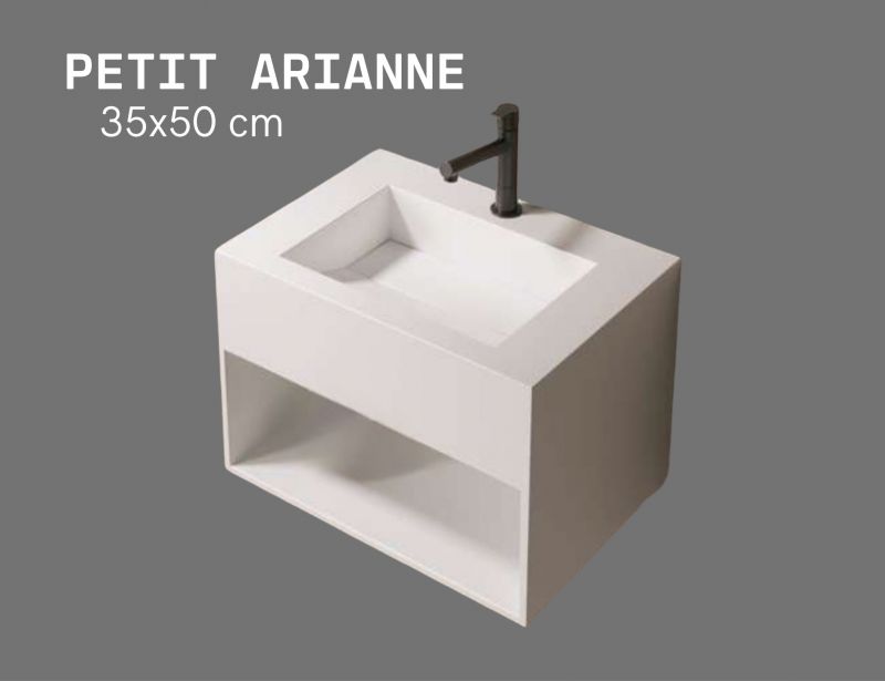 PETIT ARIANNE håndvask er en kompakt Solid Surface vask med en mat hvid overflade. Materialet består af to tredjedele naturlige mineraler og stærk harpiks, hvilket giver en ikke-porøs, antibakteriel overflade, der er holdbar og let at rengøre.
