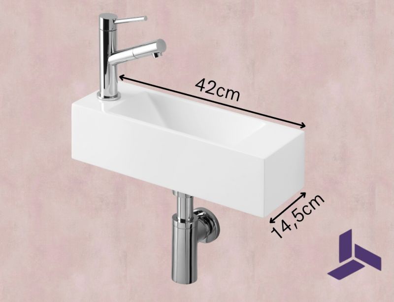 Ekstra smal væghængt håndvask 42×14,5 cm i blank hvid mineralsk harpiks