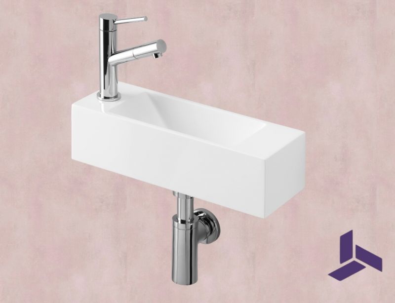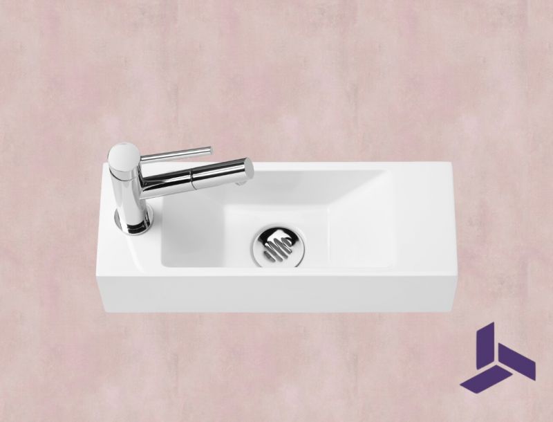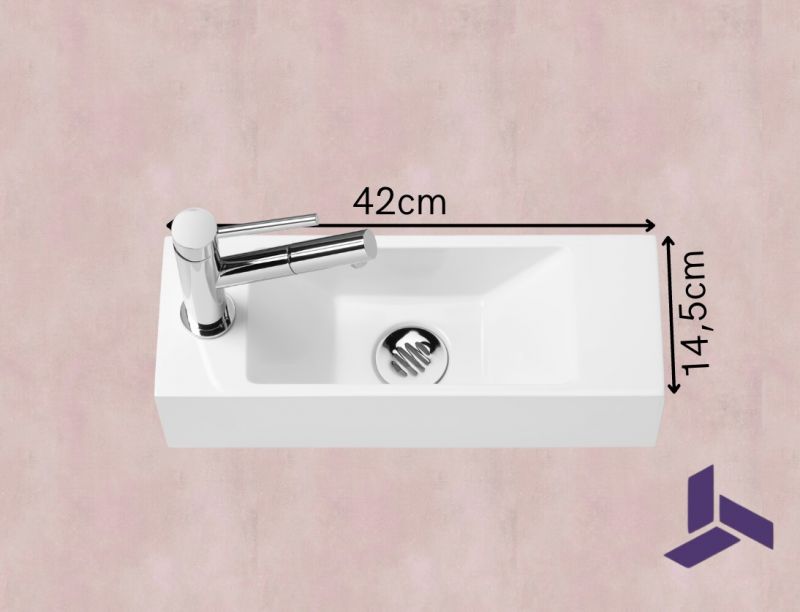 Optimér pladsen i små toiletter eller bad med denne ultratynde væghængte håndvask (42×14,5 cm). Fremstillet i højglans hvid mineralsk harpiks med minimalistiske skrå sider. Haneforboring til venstre (valgfrit højre), sidelæder 7,5×14,5 cm til sæbe eller småting.