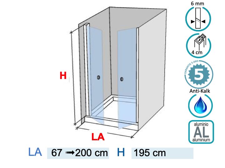 Brusedør, montering i niche, sammensat af to drejelige paneler indvendig og udvendig.