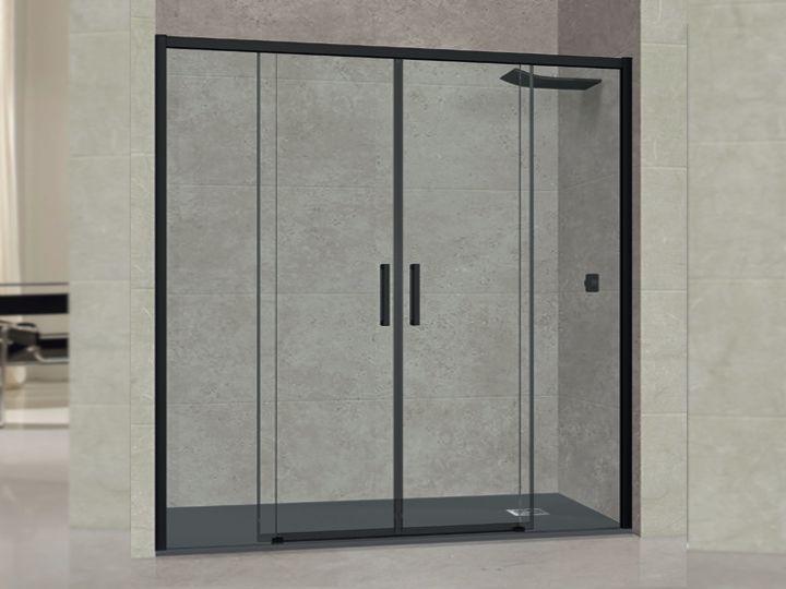 Glidebruseafskærmning, montering i niche, sammensat af to centrale skydepaneler og to faste paneler i hver ende.