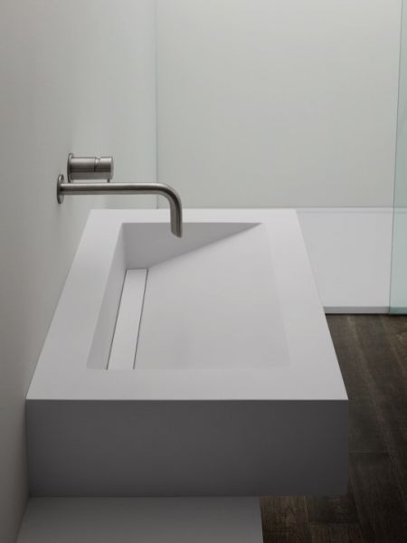 Håndvask med integreret håndvask, ophængt eller placeret på badeværelsesmøbler, i Akrytan® mineralharpiks, glat mat finish.