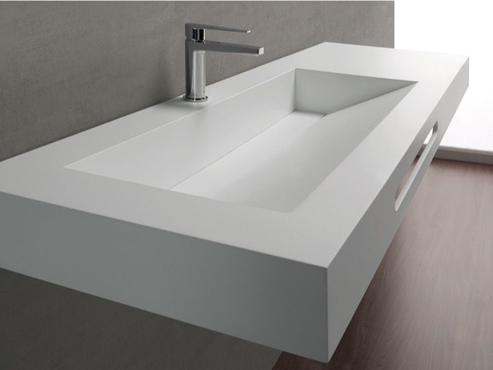 Håndvasktoppe ophængt eller forsænket i et badeværelseskab, i OSolid Plus mineralharpiks, matsteneffektstruktur eller mat glat struktur.