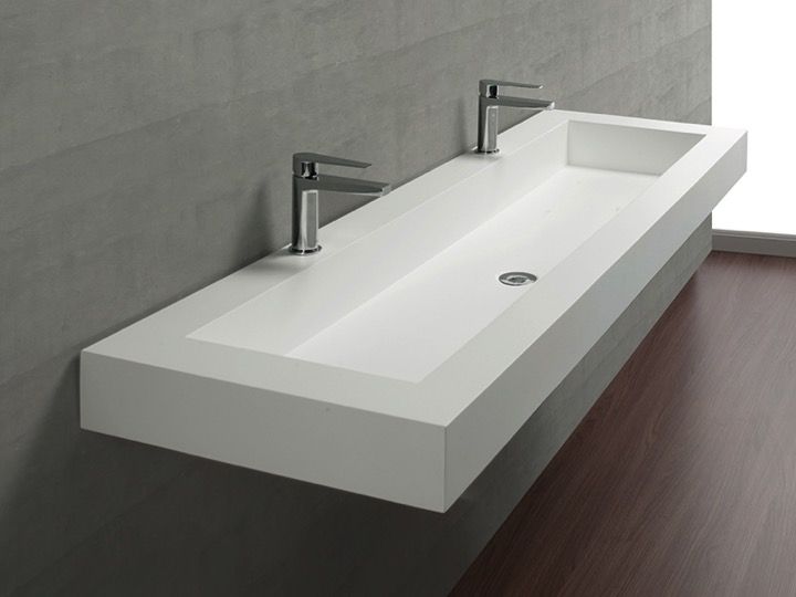 Dobbelt forfængelighedstop, ophængt eller forsænket i badeværelsesmøbler, lavet af OSolid Plus mineralharpiks, mat-sten tekstur eller mat glat struktur.