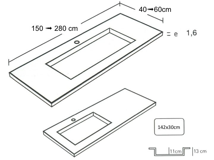 Dobbelt forfængelighedstop, 50 x 170 cm, ophængt eller forsænket, i mineralharpiks - stil 142