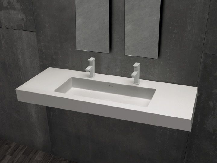 Dobbelt forfængelighedstop, ophængt eller forsænket i badeværelsesmøbler, lavet af OSolid Plus mineralharpiks, mat-sten tekstur eller mat glat struktur.