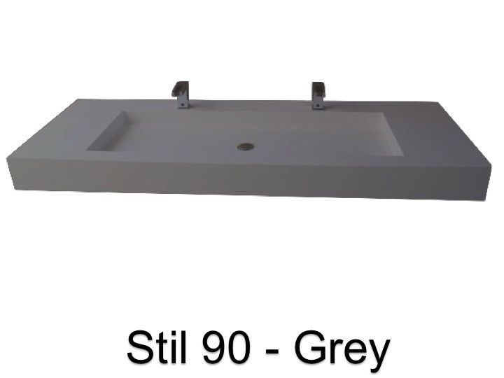 Dobbelt forfængelighedstop, ophængt eller forsænket i badeværelsesmøbler, lavet af OSolid Plus mineralharpiks, mat-sten tekstur eller mat glat struktur.