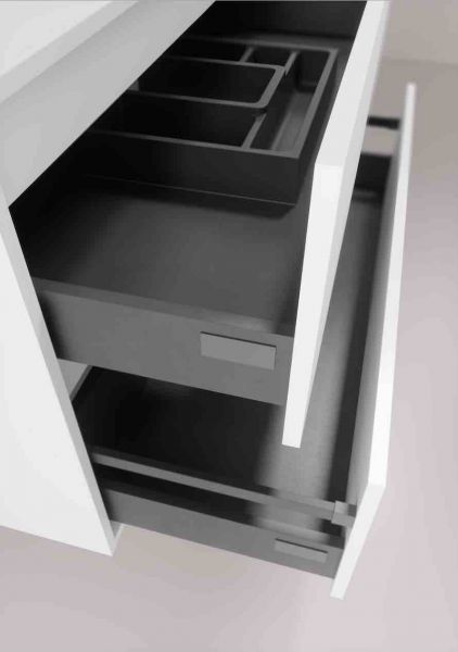 - Fronter i 1,9 cm PB melamin og 1,9 cm MDF lak; side i PB 1,6 cm med matchende kant.