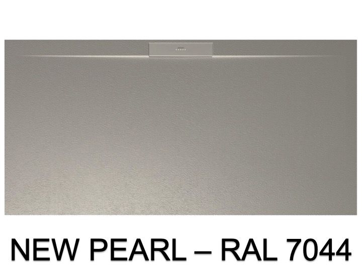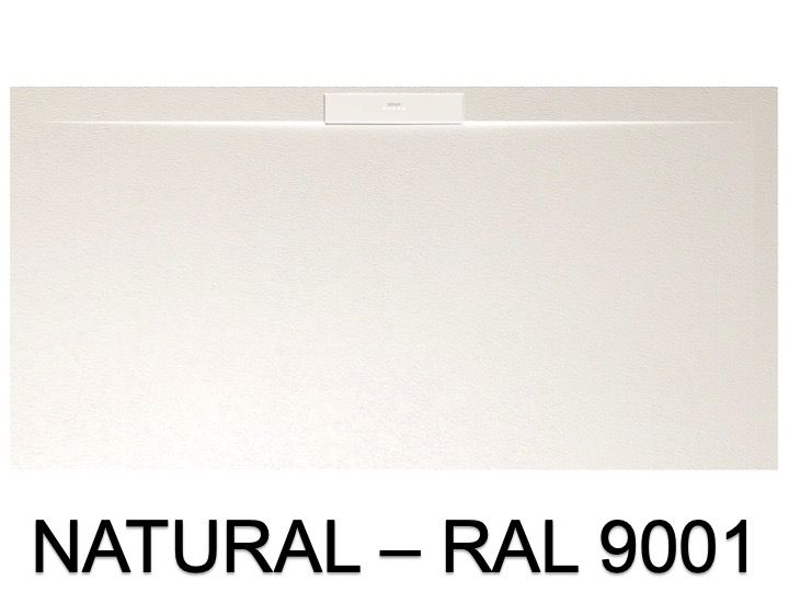 Douchebak met kanaal, van minerale hars, met een afvoer aan de voorkant en een plaat om de afvoer te verbergen, van gekleurd roestvrij staal.