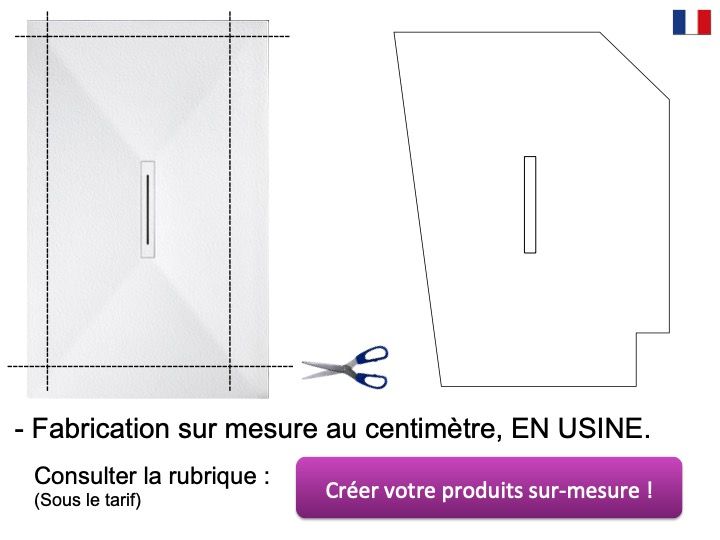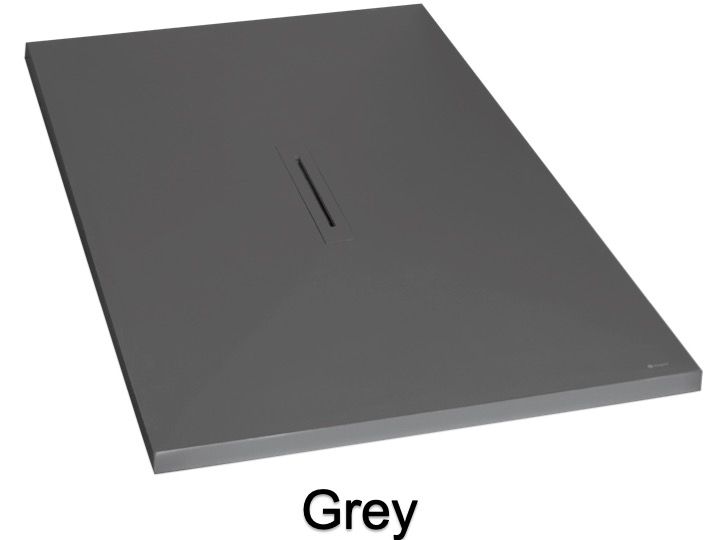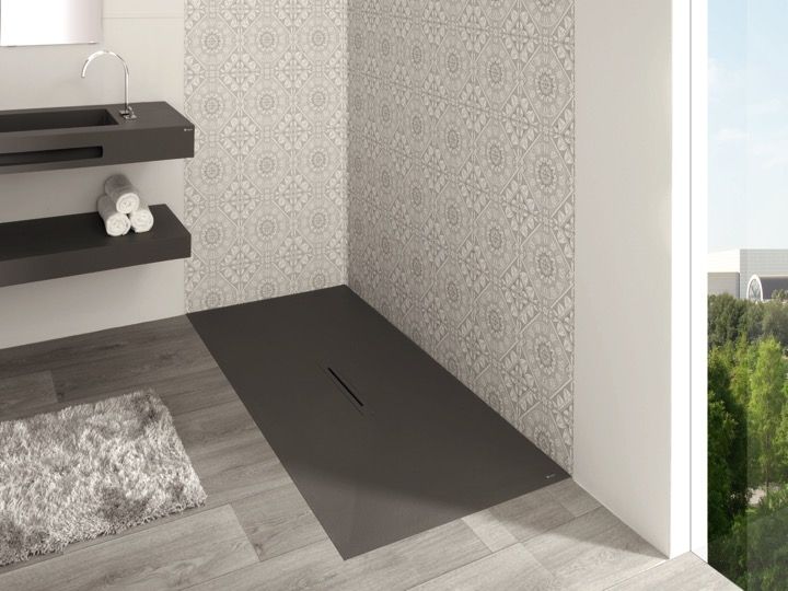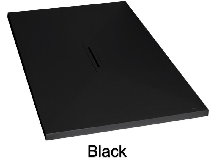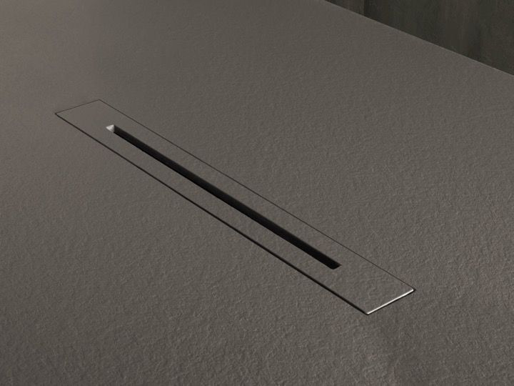 Douchebak, centrale afvoer, met designgoot, extra vlak, in Akrytan® minerale hars, op maat gemaakt, leisteenafwerking.