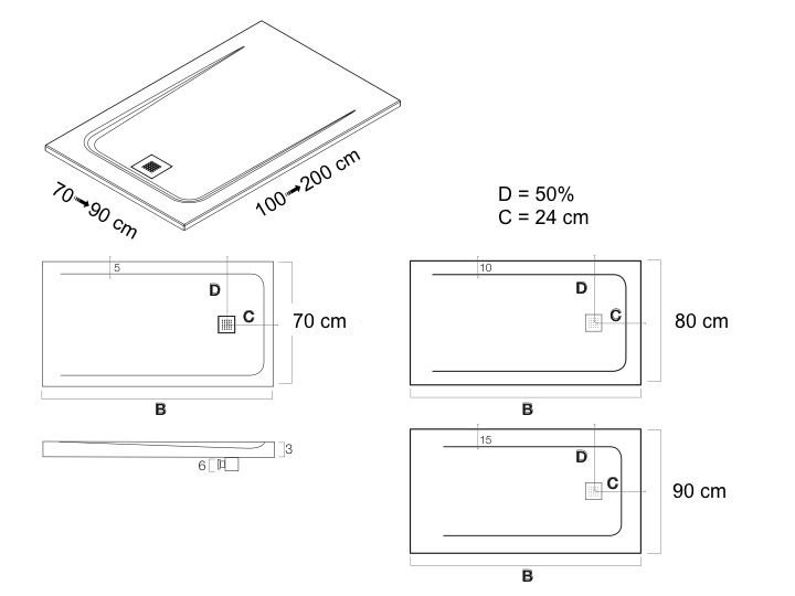 Douchebakken, in Solid Surface, op maat gemaakt en antislip.