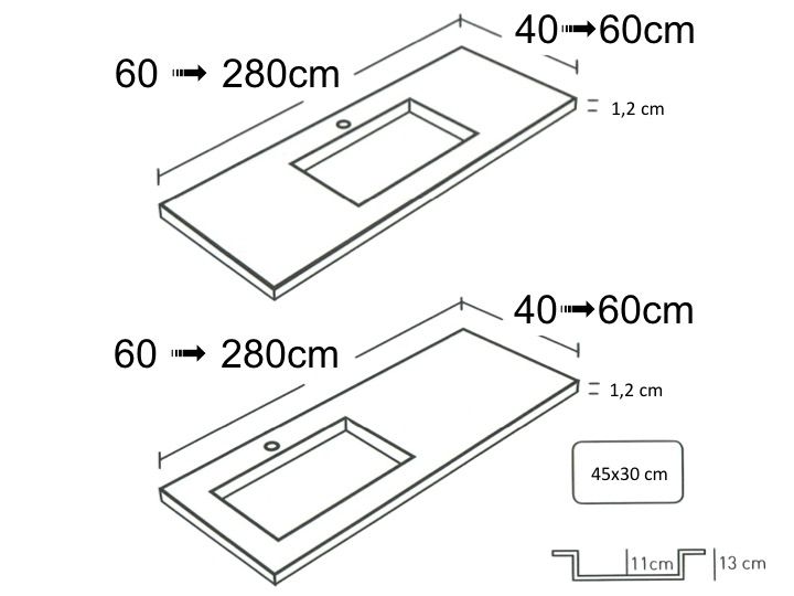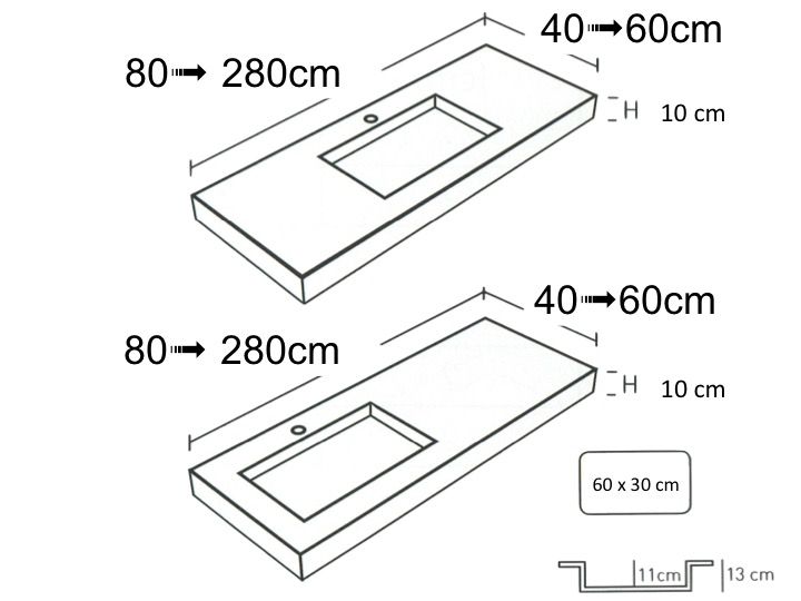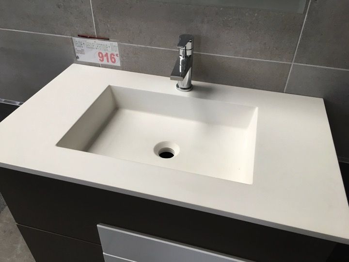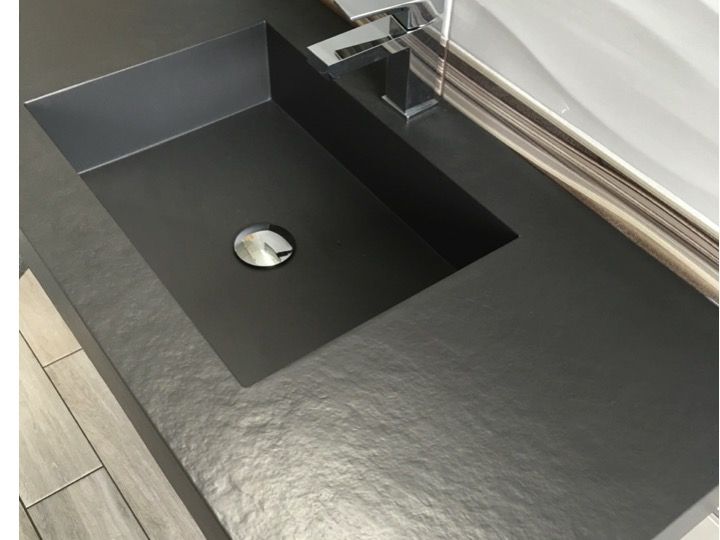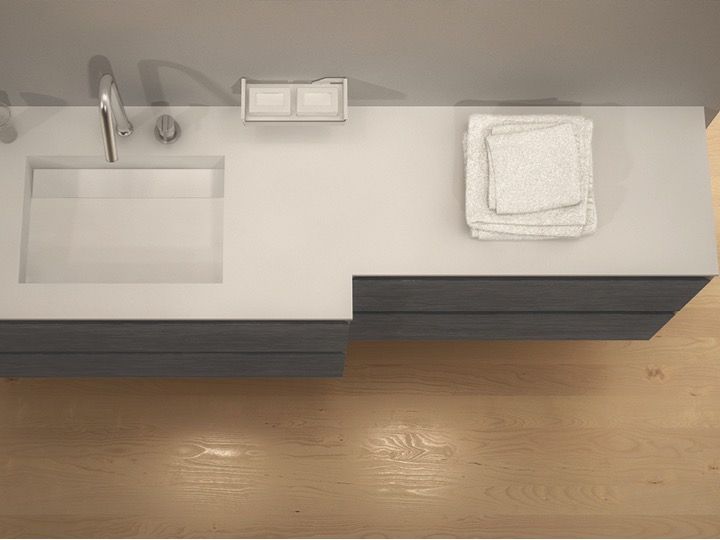 Wastafelblad opgehangen of verzonken in een badkamermeubel, in OSolid Plus minerale hars, textuur met mat steeneffect of matte textuur.