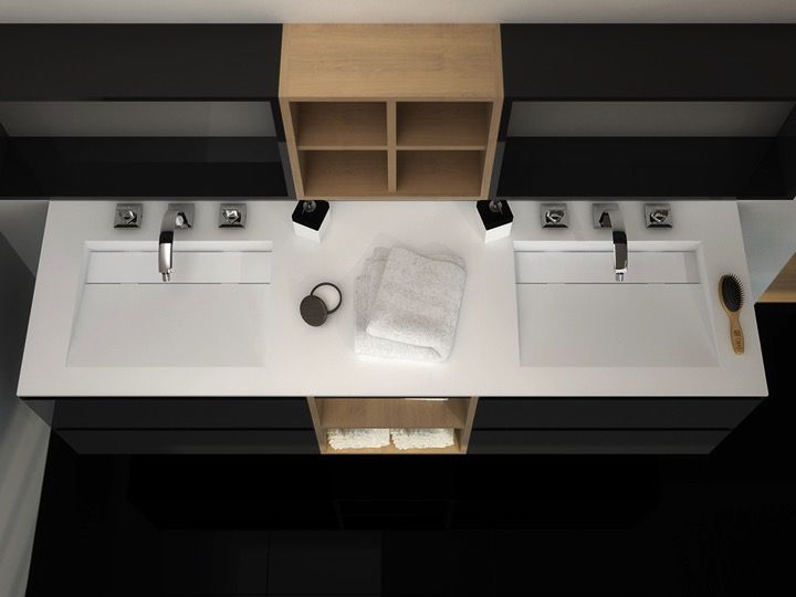 Wastafelblad opgehangen of verzonken in een badkamermeubel, in OSolid Plus minerale hars, textuur met mat steeneffect of matte textuur.