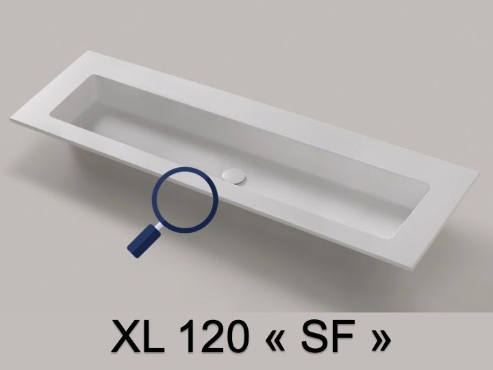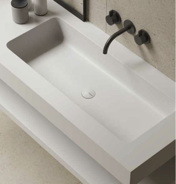 Wastafel met geïntegreerde wastafel, hangend of geplaatst op badkamermeubel, in Akrytan® minerale hars, gladde matte afwerking.