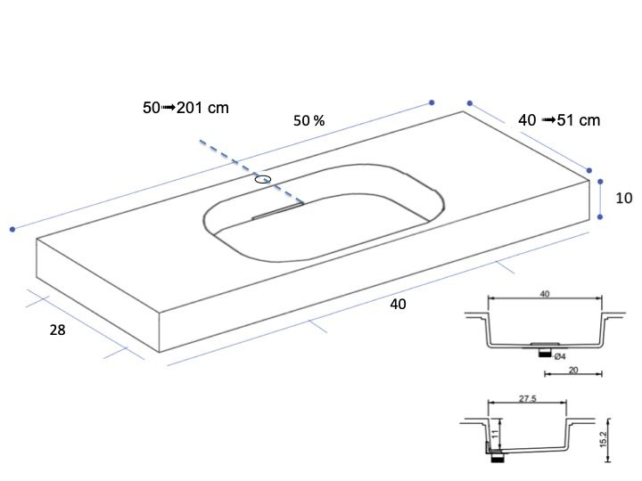 *De locatie van de wastafel op het plan kan aangepast worden, evenals het kraangat. De grootte van het zwembad kan niet worden gewijzigd.