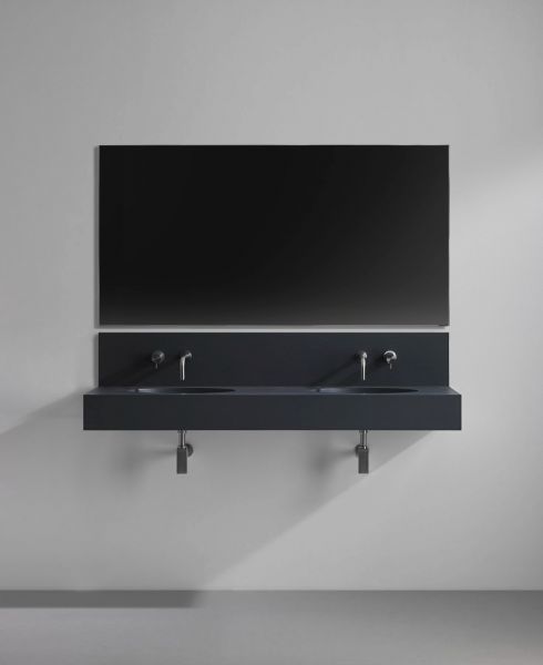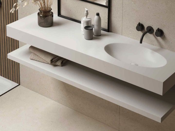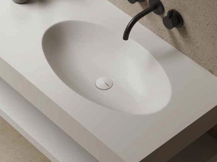 Wastafel met geïntegreerde wastafel, hangend of geplaatst op badkamermeubel, in Akrytan® minerale hars, gladde matte afwerking.