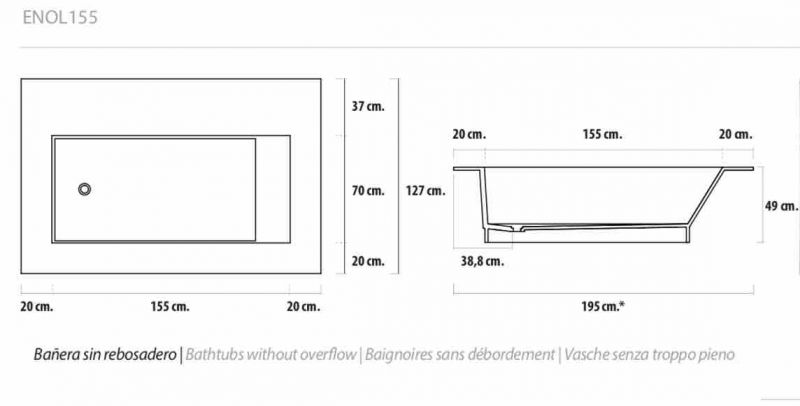 Wanna, 1950 x 1270 x 490 mm, z żywicy mineralnej solid-surface, na wymiar - enol 155