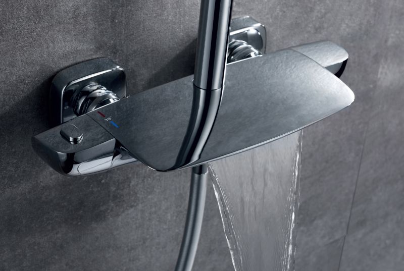 Termostatyczny zawór mieszający z chromowanego mosiądzu z wbudowanym dozownikiem i wodospadem.