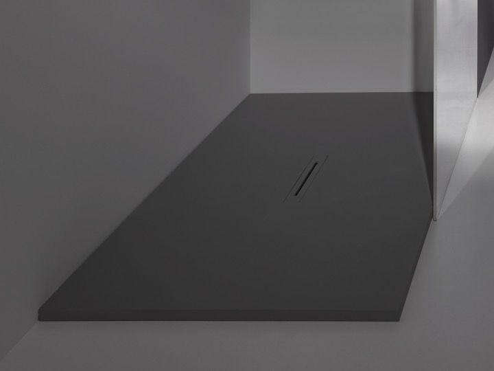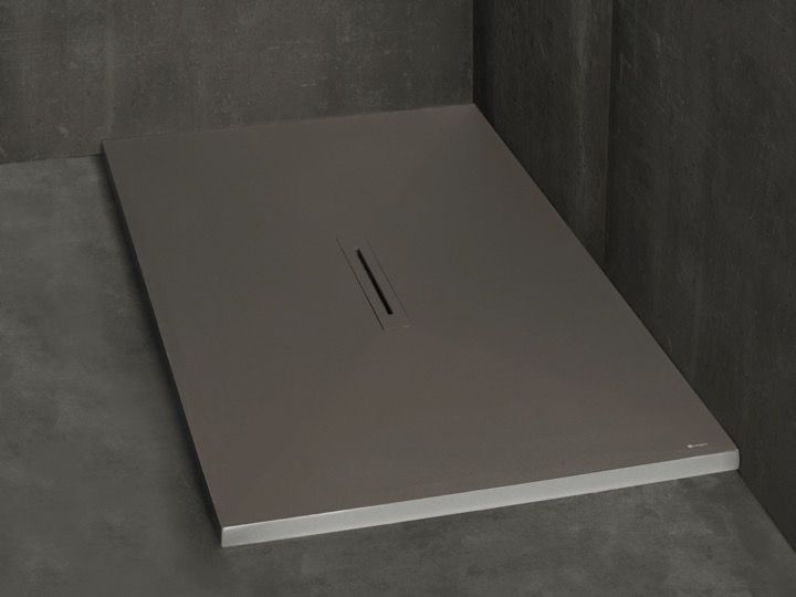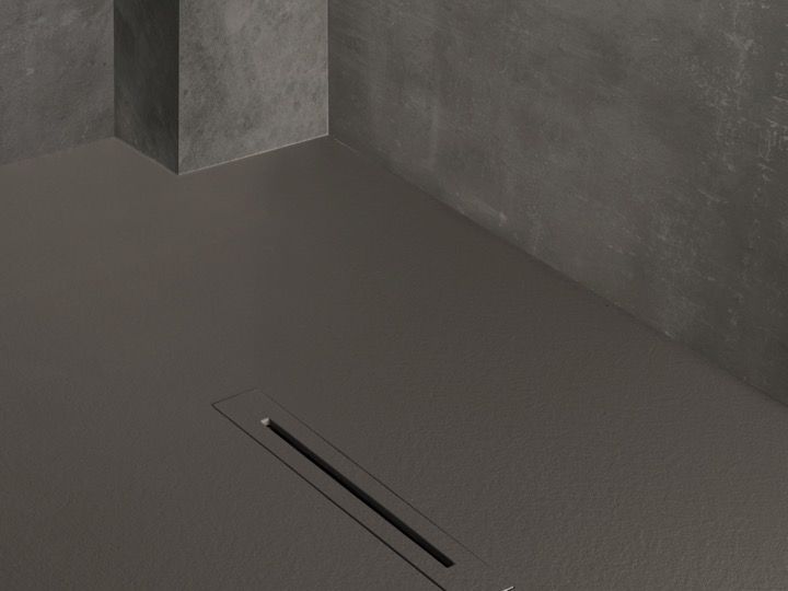 Brodzik, odpływ centralny, z designerskim odpływem, wyjątkowo płaski, z żywicy mineralnej Akrytan®, wykonany na zamówienie, wykończenie łupkowe.
