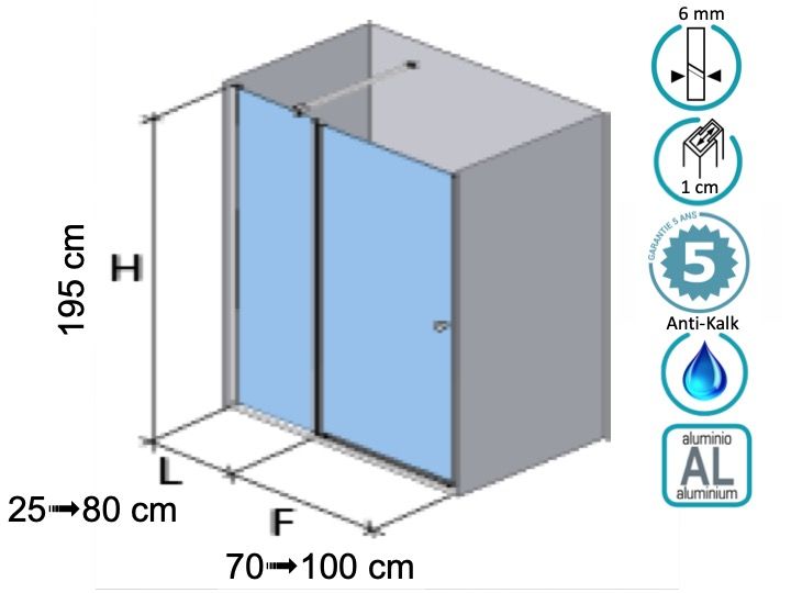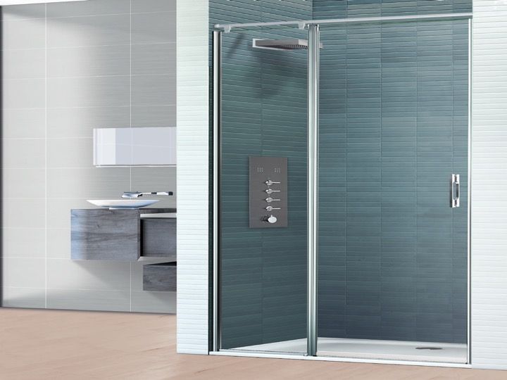 Odwracalne frontowe drzwi prysznicowe składające się z drzwi na zawiasach i ściany stałej w przedłużeniu.