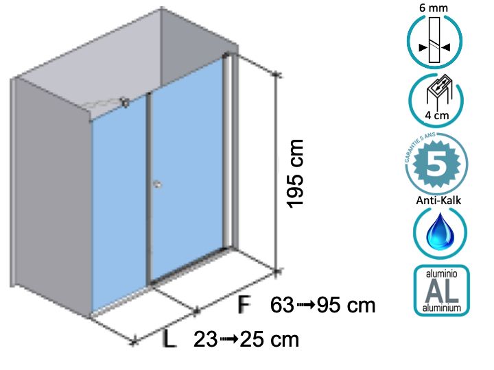 Drzwi prysznicowe uchylne, stałe 25 cm, ustawione w jednej linii - lyon 205