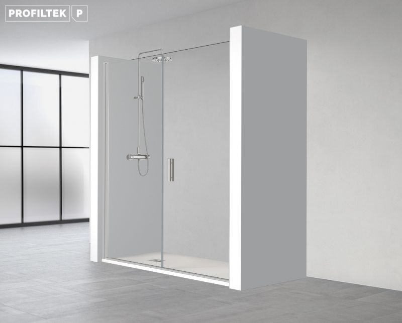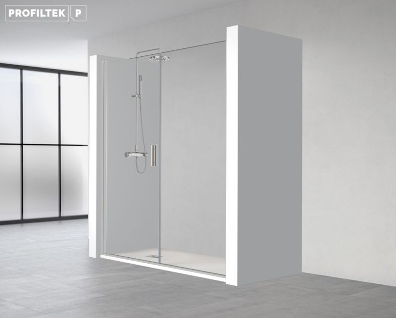 Drzwi prysznicowe, montaż we wnęce, składające się z panelu obrotowego od wewnątrz i na zewnątrz oraz panelu stałego o długości 25 cm, ustawionego w jednej linii.