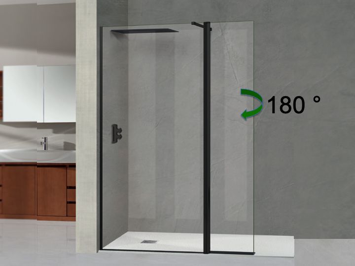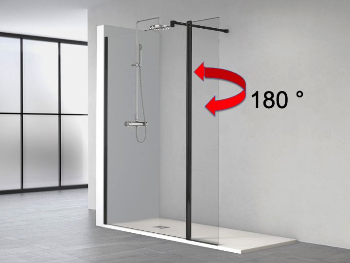 Stały ekran prysznicowy z przedłużoną roletą uchylną, obracaną o 180, do użytku wewnątrz i na zewnątrz.