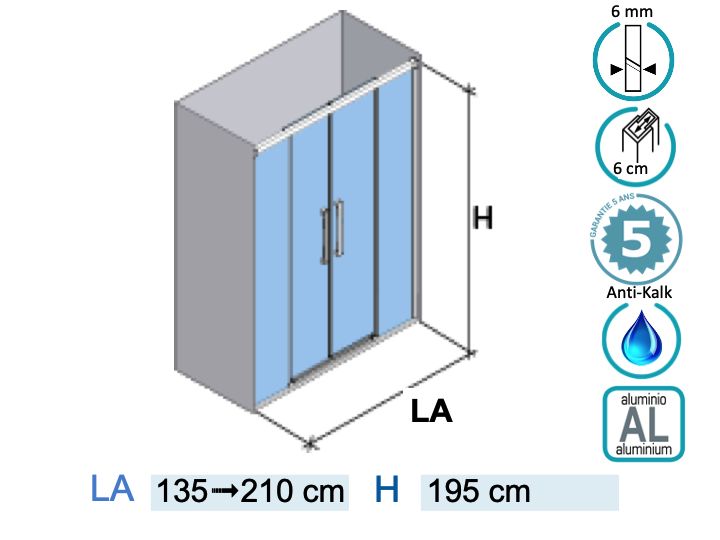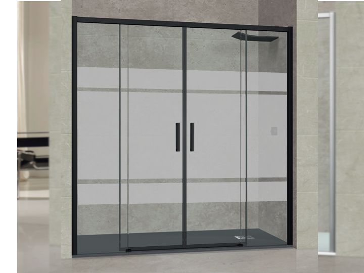 Przesuwany ekran prysznicowy, montaż we wnęce, składający się z dwóch środkowych paneli przesuwnych i dwóch stałych paneli na każdym końcu.