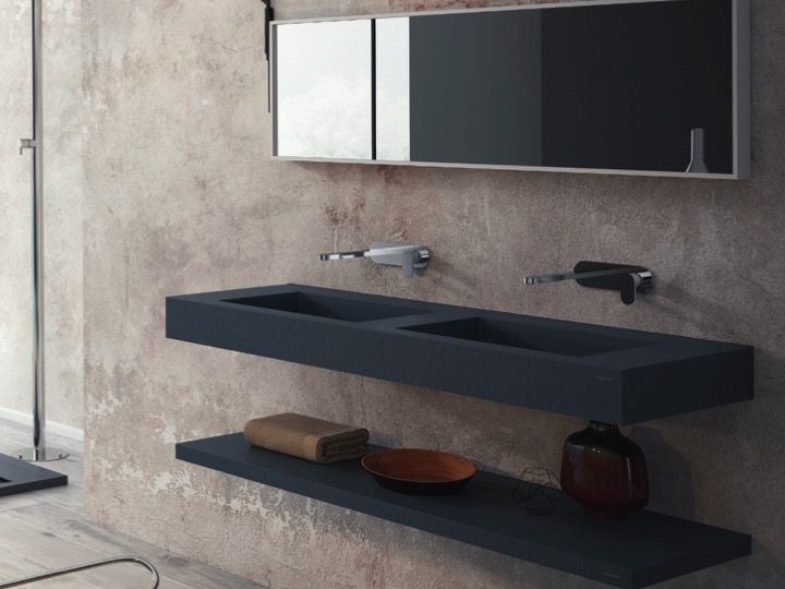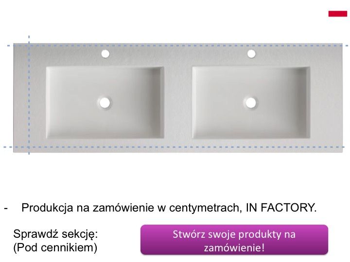Blat z podwójną toaletką, zawieszony lub wpuszczony w meble łazienkowe, wykonany z żywicy mineralnej OSolid Plus, o fakturze matowo-kamiennej lub o matowej gładkiej fakturze.