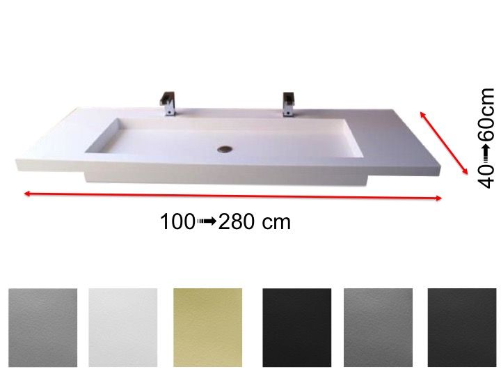 Blat z podwójną toaletką, zawieszony lub wpuszczony w meble łazienkowe, wykonany z żywicy mineralnej OSolid Plus, o fakturze matowo-kamiennej lub o matowej gładkiej fakturze.